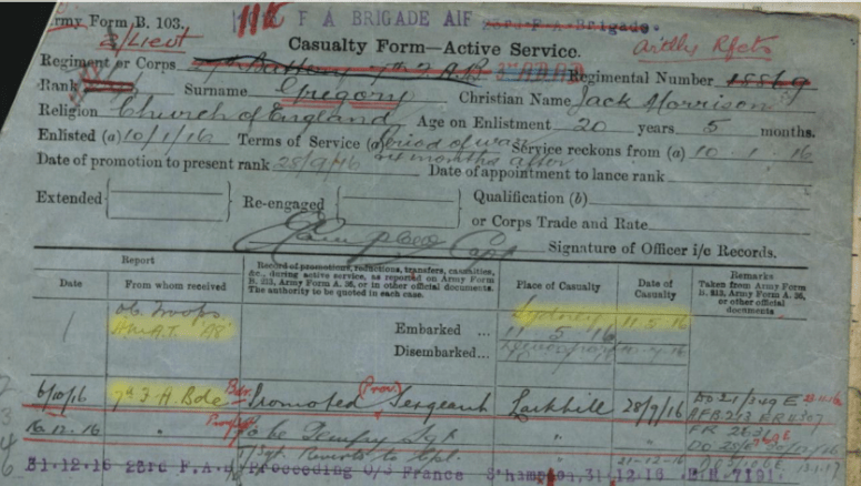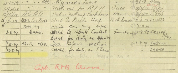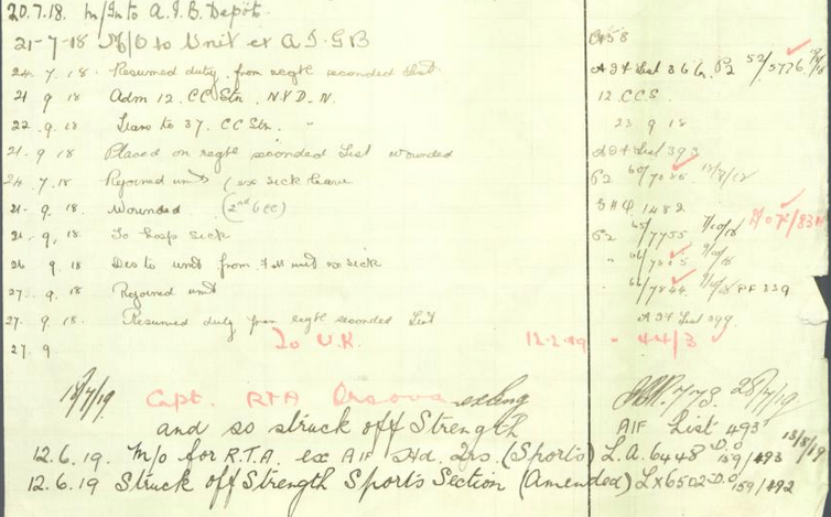 After my reporting on Kelleway some weeks ago, it’s interesting to note that Kelleway has been telling reporters that he has not yet thoroughly recovered from the effects of wounds–the last being a knock on the head from shrapnel just before the cessation of hostilitiesNot Out, Captain Kelleway Returns, Referee (NSW), Wed 10 Sep 1919, p. 9. http://nla.gov.au/nla.news-article120303192 and a leg wound that is causing him troubleKelleway Retires, Advocate (Tas), Mon 30 Jun 1919, p. 3. http://nla.gov.au/nla.news-article66491346 –and that his return is in accordance with an arrangement made at the beginning of the A.I.F. tour, where he only ever intended to stay until 30 June, when his granted leave expired, and that he would play in all matches possible up until thenFree Lance, Men and Matters, Star Green ‘Un (Yorkshire), Sat 5 Jul 1919, p. 1. . My sources at HQ inform me that there was no leave approved, and that he was instead struck off strength from his secondment to the AIF Sports Control Board