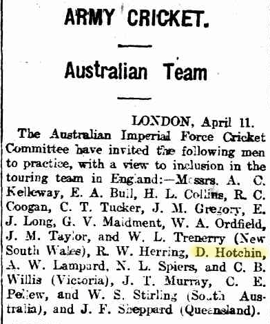 Travelling with us on this tour, and playing in the second game in Edinburgh was Cliff O’ConnorWestern District Eleven v. Australians, The Scotsman (Midlothian), Wed 2 Jul 1919, p. 10. . Known as “Oakey” to his Waverley team matesNot Out, Some Cricket Notches, Arrow Fri 11 Apr 1924, p. 8. http://nla.gov.au/nla.news-article103546072 in Sydney, he travelled to the war NAA: B2455, O’CONNOR CLIFFORD CARL, p. 18. https://recordsearch.naa.gov.au/SearchNRetrieve/Interface/ViewImage.aspx?B=7993834 on the H.M.A.T. ArgyllshireUnknown, HMAT Argyllshire and the Empress of Asia in Colombo Harbour, Ceylon, c1914-1918, photograph, AWM C02356, https://www.awm.gov.au/collection/C1012589 with GregoryNAA: B2455, GREGORY J M, p. 30. https://recordsearch.naa.gov.au/SearchNRetrieve/Interface/ViewImage.aspx?B=4679973 and the Governor GeneralConcerning Macartney, The Sun (NSW), Mon 22 Jul 1912, p. 5. http://nla.gov.au/nla.news-article228830692 himselfNAA: B2455, MACARTNEY C G, p. 7. https://recordsearch.naa.gov.au/SearchNRetrieve/Interface/ViewImage.aspx?B=1991740 Charlie MacartneyUnknown, C.G. Macartney, c1920, photograph, https://upload.wikimedia.org/wikipedia/en/c/c5/CGMacartney.jpg –with the 7th Field Artillery Brigade. The ‘7th’ is well represented on the cricket fields of England. Eric BullEric Bull (right), with J. T. Murray, Unknown, Two members of the AIF Cricket Eleven, 1919, photograph, AWM D00682, https://www.awm.gov.au/collection/C389704 , in the side since the Surrey match, was another member of that illustrious brigade, and they also had amongst their ranks the Victorian shield player M. D. HotchinM. D. Hotchin and H. Bracher Open Home Team’s Second Innings, The Herald (Vic), Tue 29 Dec 1914, p. 1. http://nla.gov.au/nla.news-article242269659 , who was invited to the cricket trials back in MayArmy Cricket, The Express and Telegraph (SA), Mon 14 Apr 1919, p. 2. http://nla.gov.au/nla.news-article210590972 .