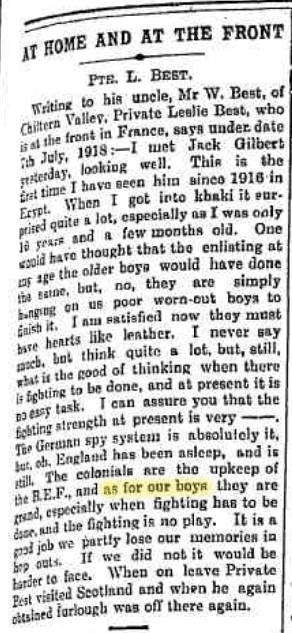 Pte. L. Best, At Home And At The Front, Rutherglen Sun and Chiltern Valley Advertiser (Vic), Tue 24 Sep 1918, p. 3. http://nla.gov.au/nla.news-article121020855 , we only had the one game against Essex. Fine weather again prevailed