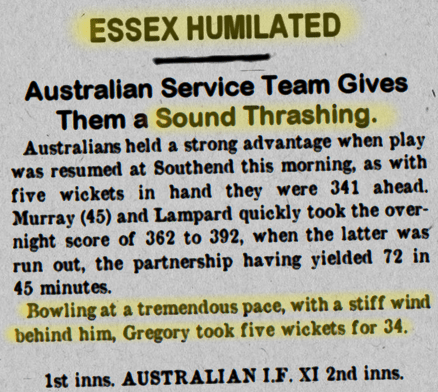 Essex v. Australians, Leicester Daily Post (Leicestershire), Sat 23 Aug 1919, p. 4., as did the strong crowdsDay 1: 4000. Day 2: 2-3000. Day 3: 2000. Essex v. Australians, The Sportsman (London), Fri 22 Aug, 1919, p.1. Essex v. Australians, Leicester Daily Post (Leicestershire), Sat 23 Aug, 1919, p.4. Essex Humiliated, Star Green ‘Un (Yorkshire), Sat 23 Aug, 1919, p.2.. Bowling at a tremendous pace, with a stiff wind behind him, Gregory took five wickets for 34, humiliating Essex with a sound thrashing by 309 runs