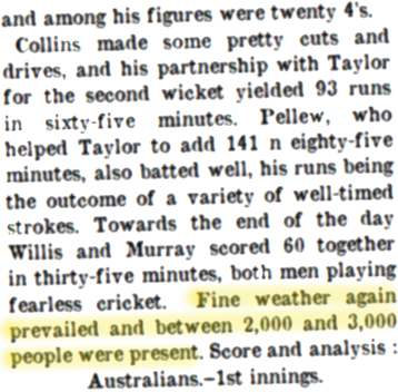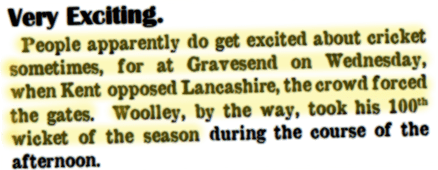 Flashes and Glances, Star Green ‘Un (Yorkshire), Sat 23 Aug 1919, p. 1.. Going back to the three-days system is a good start, but the popularity of the game is noticeable elsewhere. People apparently do get excited about cricket sometimes, for at Gravesend on Wednesday, when Kent opposed Lancashire, the crowd forced the gates to see Woolley take his 100th wicket of the season