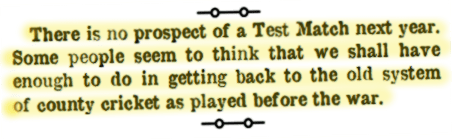 There is apparently no prospect of a Test Match next year. Some people seem to think that there is enough to do in getting back to the old system of county cricket as played before the war