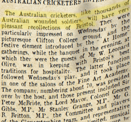 Australian and Somerset Cricketers, Taunton Courier, and Western Advertiser (Somerset), Wed 3 Sep 1919, p. 6. . The Australian cricketers, like thousands of Australian wounded soldiers, will have very pleasant recollections of Bristol