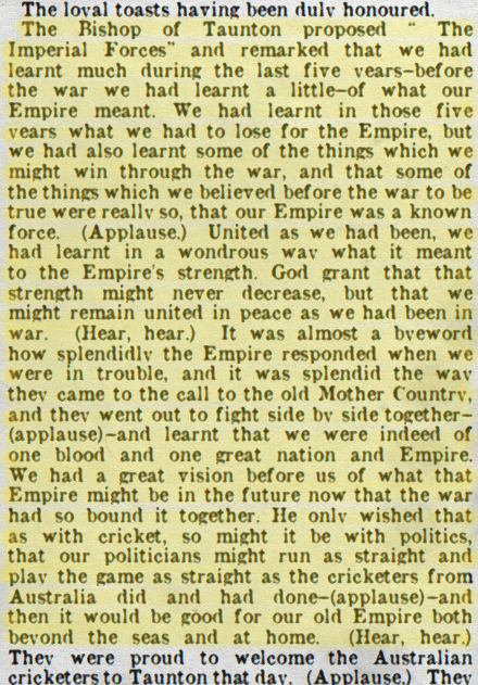 The Bishop of Taunton proposed “The Imperial Forces” and remarked that ‘we have learnt much during the last five years – before the war we had learnt a little – of what our Empire meant. We had learnt in those five years what we had to lose for the Empire, but we had also learnt some of these things which we might win through the war, and that some of the things which we believed before the war to be true were really so, that our Empire was a known force. United as we had been, we had learnt in a wondrous way what it meant to the Empire’s strength. God grant that that strength might never decrease, but that we might remain united in peace as we had been in war. It was almost a byeword how splendidly the Empire responded when we were in trouble, and it was splendid the way they came to the call to the old Mother Country, and they went out to fight side by side together and learnt that we were indeed of one blood and one great nation and Empire. We had a great vision before us of what that Empire might be in the future now that the war had so bound it together. He only wished that as with cricket, so might it be with politics, that our politicians might run as straight and play the game as straight as the cricketers from Australia did and had done and then it would be good for our old Empire both beyond the seas and at home’