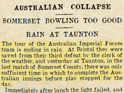 Australian and Somerset Cricketers, Taunton Courier, and Western Advertiser (Somerset), Wed 3 Sep 1919, p. 6. .