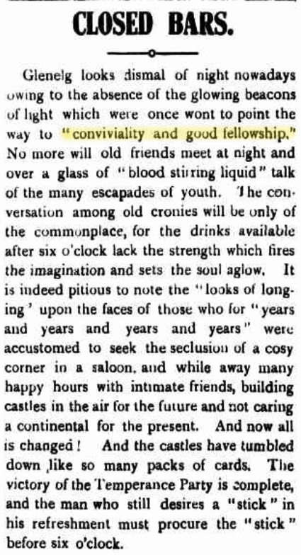 Closed Bars, Glenelg Guardian (SA), Thu 30 Mar 1916, p. 2. http://nla.gov.au/nla.news-article214712878 . In particular, I would like to quote several speeches from our dinner at Taunton, which drove home