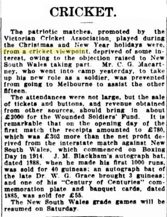 Fred M. White, The Lady In Blue, Newcastle Morning Herald and Miners’ Advocate (NSW), Mon 3 Apr 1916, p. 2. http://nla.gov.au/nla.news-article137102025 , and why the cricket has been secondary to their duty to the Empire