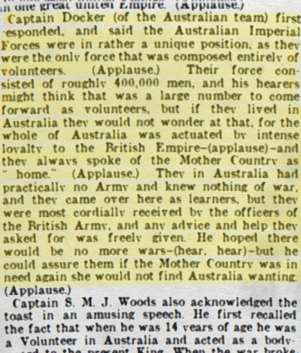 Captain Docker responded on behalf of the Australians, and said the Australian Imperial Forces were in rather a unique position, as they were the only force that was composed entirely of volunteers. Their force consisted of roughly 400,000 men, and his hearers might think that was a large number to come forward as volunteers, but if they lived in Australia they would not wonder at that, for the whole of Australia was actuated by intense loyalty to the British Empire and they always spoke of the Mother Country as “home.” They in Australia had practically no Army and knew nothing of war, and they came over here as learners, but they were most cordially received by the officers of the British Army, and any advice and help they asked for was freely given. He hoped there would be no more wars but he could assure them if the Mother Country was in need again she would not find Australia wanting