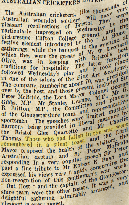 Australian Cricketers Entertained, Western Daily Press (Bristol), Fri 29 Aug 1919, p. 4. .
