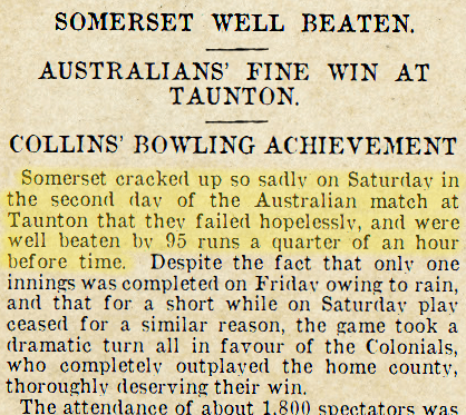 Australian Collapse, Western Daily Press (Bristol), Sat 30 Aug 1919, p. 7. . Somerset cracked up so sadly on the second day that they failed hopelessly, and were well beaten by 95 runs a quarter of an hour before time