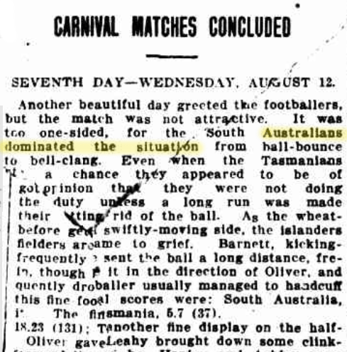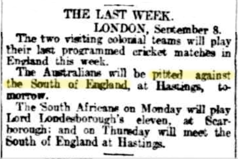 The Last Week, The Register (SA), Mon 9 Sep 1912, p. 7. http://nla.gov.au/nla.news-article58597612 . On a slow wicket, and before the carried and cleverly-handled Australians’ attack, the South of England side, lacking only a sprinkling of Surrey men to make it complete, was dismissed cheaply