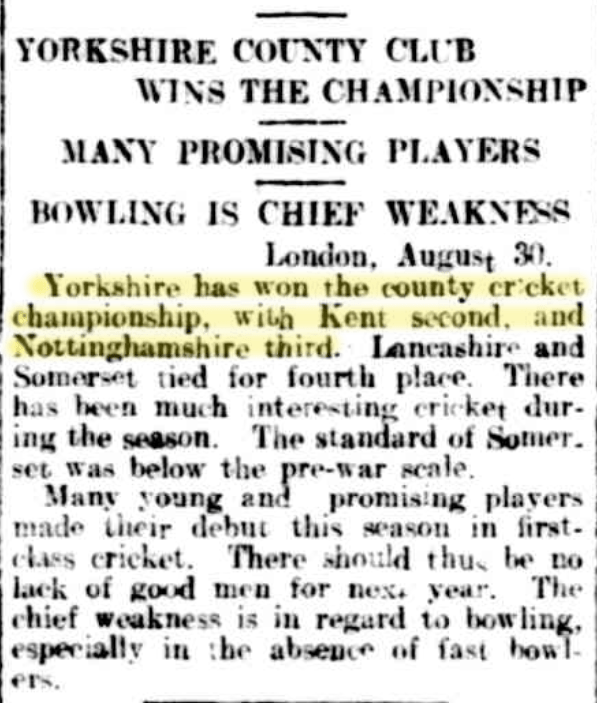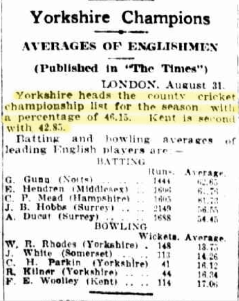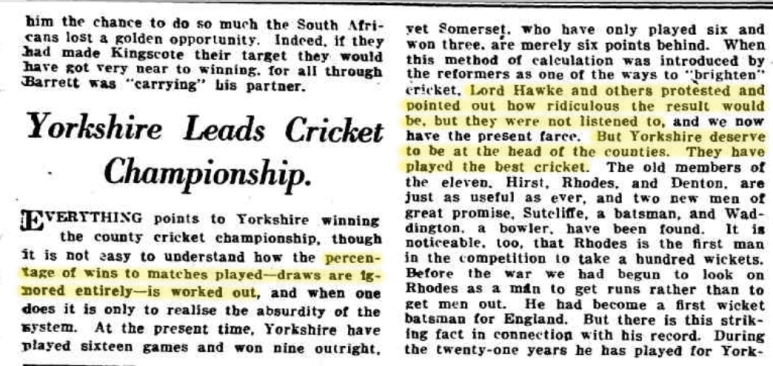 Yorkshire County Club Wins The Championship, Barrier Miner (NSW), Wed 3 Sep 1919, p. 2. http://nla.gov.au/nla.news-article45541715 . To decide the Championship, a peculiar system of percentage of wins to matches played–draws are ignored entirely–is worked out. At the beginning of the season Lord Hawke and others protested and pointed out how ridiculous the result would be, but they were not listened to. But Yorkshire deserve to be at the head of the counties. They have played the best cricket