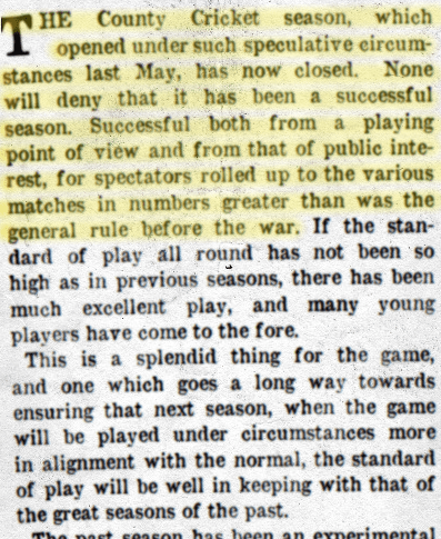 The County Cricket season, which opened under such speculative circumstances last May, has now closed. None will deny that it has been a successful season. Successful both from a playing point of view and from that of public interest, for spectators rolled up to the various matches in numbers greater than was the general rule before the war