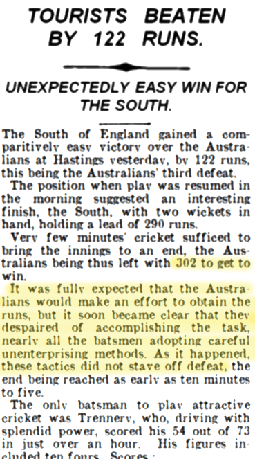 Cricket Crumbs, Truth (WA), Sat 28 Oct 1911, p. 12. http://nla.gov.au/nla.news-article208698574 , and a strong second innings from South saw the Australians needing 302 with nearly all of day 3 to get them. It was fully expected that the Australians would make an effort to obtain the runs, but it soon became clear that they despaired of accomplishing the task, nearly all the batsmen adopting careful unenterprising methods. As it happened these tactics did not stave off defeat