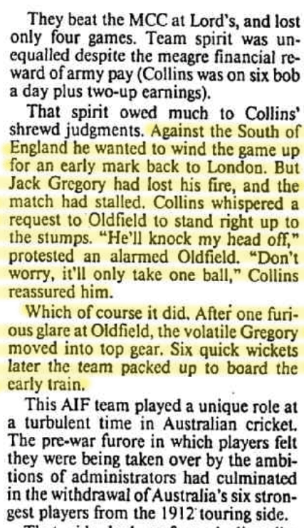 South of England v. Australians, Leicester Daily Post (Leicestershire), Sat 6 Sep 1919, p. 4.. The team were tempted by an early finish on day 2 so they could get the early train back to London. But Jack Gregory had lost his fire, and the match had stalled. Collins whispered a request to Oldfield to stand right up to the stumps. “He’ll knock my head off” protested an alarmed Oldfield. “Don’t worry, it’ll only take one ball” replied Collins. Which of course it did. After one furious glare at Oldfield, the volatile moved into top gear