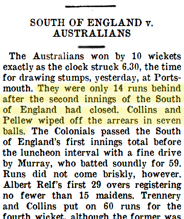Carnival Matches Concluded, Referee (NSW), Wed 19 Aug 1914, p. 12. http://nla.gov.au/nla.news-article120282923 , winning by 10 wickets. They were only 14 runs behind after the second innings of the South of England had closed. Collins and Pellew wiped off the arrears in seven balls