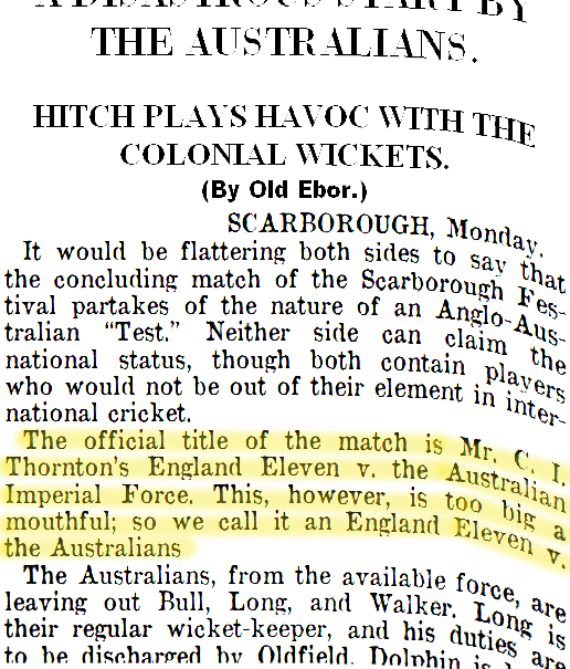 A Disastrous Start by the Australians, Yorkshire Evening Post (Yorkshire), Mon 8 Sep 1919, p. 8.. However, it is arguable that this title is not necessary for only ease of telling alone, but that it is a fair assessment of the game. After all, the 1912 Australians were missing the Big Six, and could still rightfully claim their place as an Australian XI. Hobbs