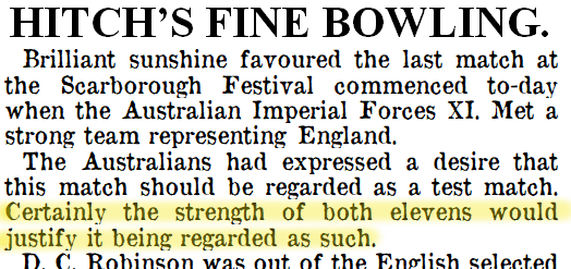 Frank Iredale, A.I.F. Cricket, The Sun (Sydney), Sun 14 Sep 1919, p. 8. http://nla.gov.au/nla.news-article221981010 . Mr. C. I. Thornton collected a very representative England team, and in all but in name the game is a Test match. The Australians had expressed a desire that this match should be regarded as a test match