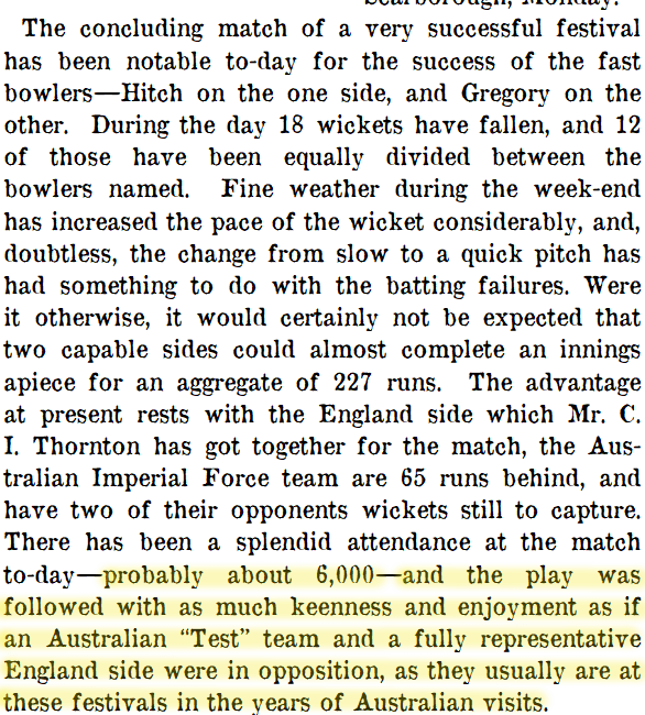 A Fine Recovery By The Australians, Yorkshire Evening Post, (Yorkshire), Wed 10 Sep 1919, p. 8. . The play was followed with as much keenness and enjoyment as if an Australian “Test” team and a fully representative England side were in opposition, as they usually are at the festivals in the years of Australian visits