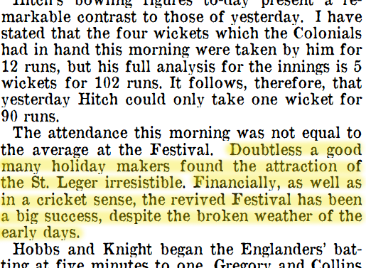 The Scarborough Festival, Yorkshire Post and Leeds Intelligencer (Yorkshire), Tue 9 Sep 1919, p. 12. . On day 3 doubtless a good many holiday makers found the attraction of the St. Leger irresistible. Financially, as well as in a cricket sense, the revived Festival has been a big success, despite the broken weather of the early days